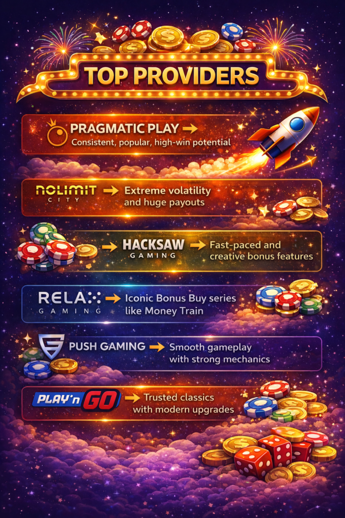 | 2️⃣ Nolimit City | Nolimit City is a premium slot provider known for its high-risk, high-reward gameplay. Founded in 2013, the studio has built a reputation for pushing boundaries with unique mechanics and extreme volatility. | – Very high max win potential – Advanced bonus features and mechanics – Designed for experienced players – Innovative storytelling and themes | – Deadwood – San Quentin – Mental – East Coast vs West Coast – Folsom Prison | Very High / Extreme |